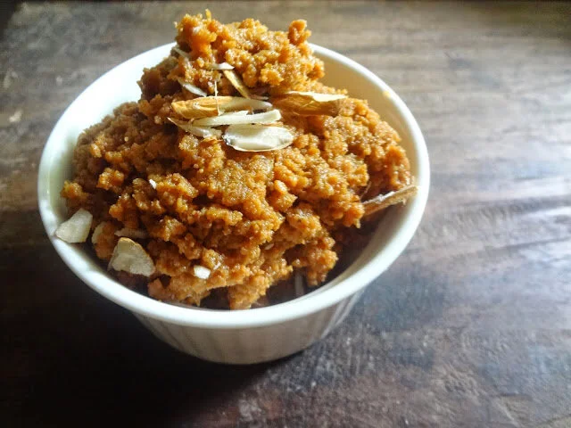 Keep cooking on a very low flame till completely reduced to a thick , grainy smooth mass almost dough like.Remove from pan, let it cool, garnish with slivers of nuts.