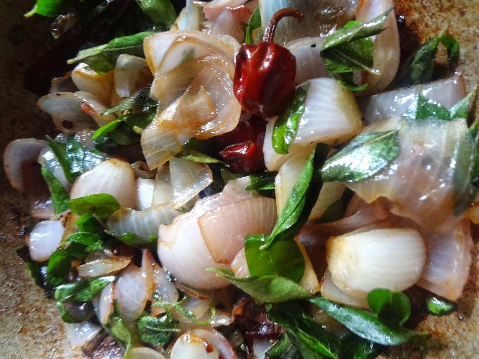 In a pan add the oil, sautee the choped onions, red chillies, tamrind, till the onions become lightly charred and transparent. The tamrind will also get softened.