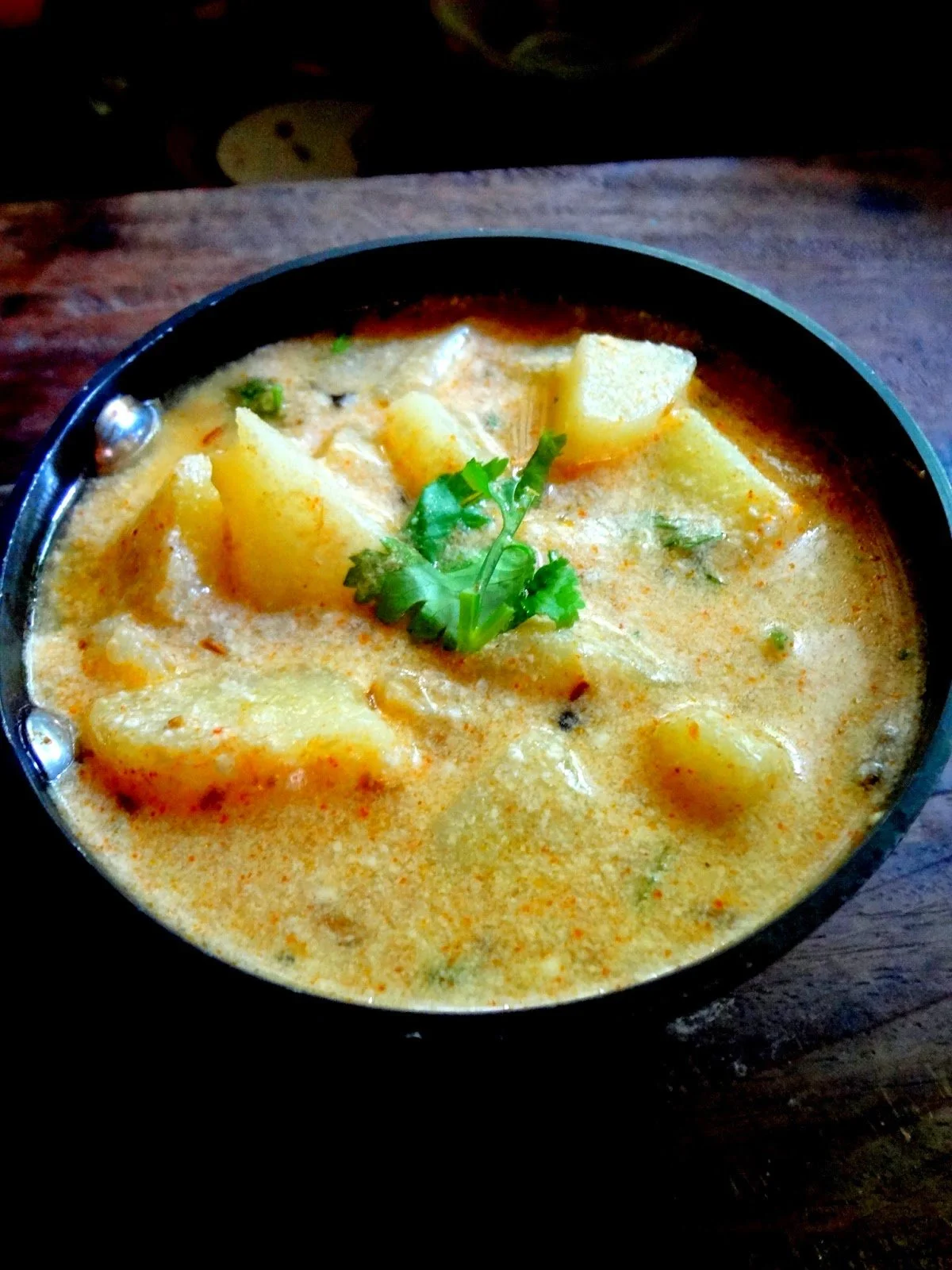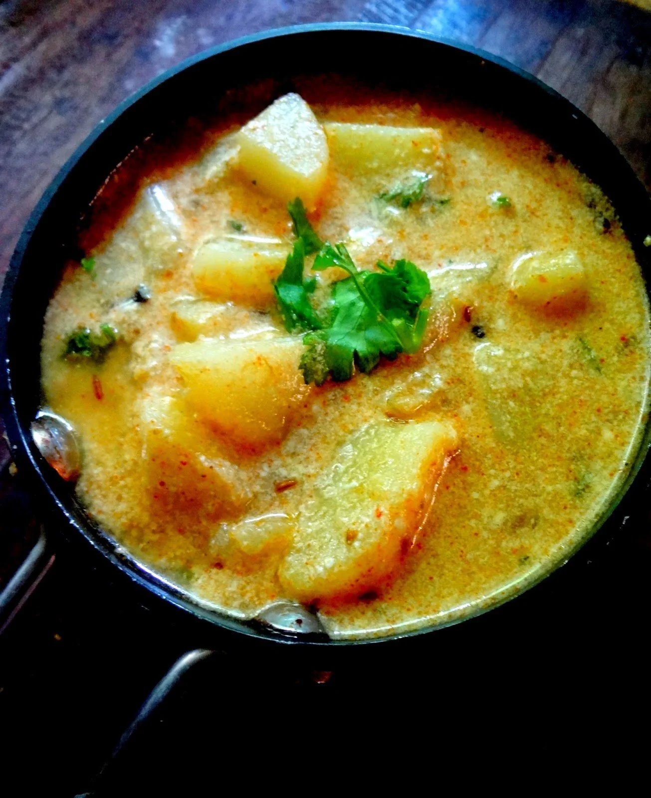 Dahiwale aloo or potatoes cooked and simmered in a mildly spiced yogurt curry makes an excellent side dish on fasting days to go with Rajgira ( Amaranth flour ) parathas, pooris or rotis.