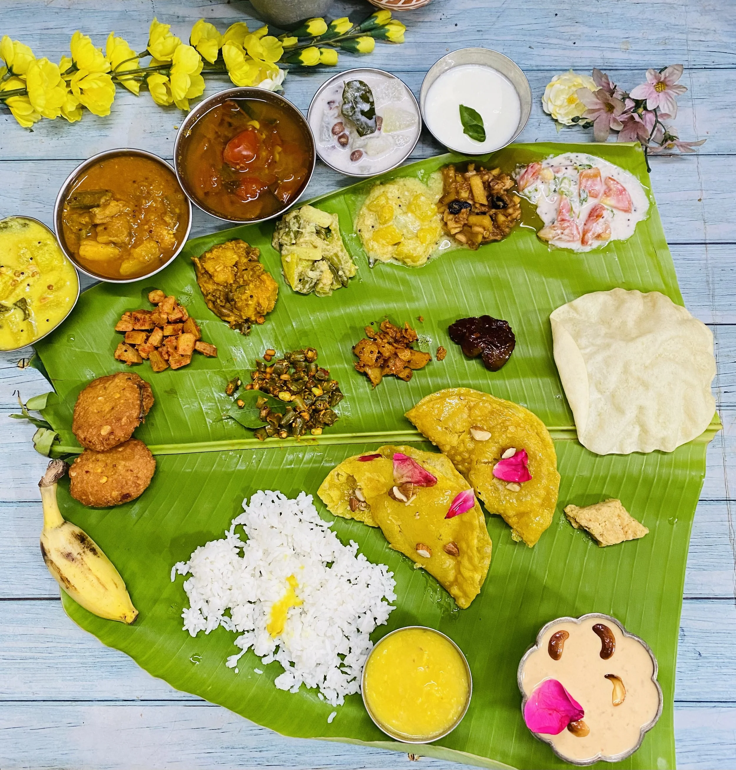 A traditional South Indian festival lunch is a grand affair, celebrated with a variety of dishes that are meticulously prepared and served on a banana leaf. The meal is typically vegetarian and includes a balance of flavors—sweet, spicy, tangy, and savory. Here’s a general description of the items usually included: