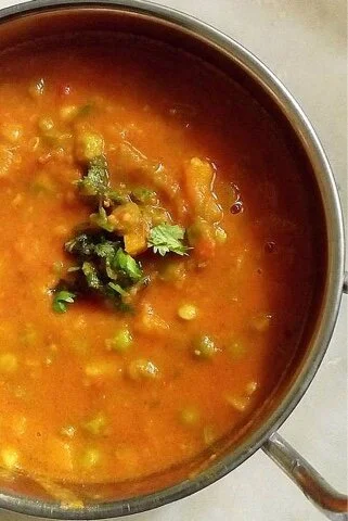 Green peas with mixed vegetables to make a yummy masala side dish for phulkas or even basmati rice . I call it a bachelors recipe as it is all made in the pressure cooker which is probably the only main cooking appliance with a bachelor . The ease with which this dish can be made will tempt the busy housewife too. While this is a no onion no garlic dish you can easily add them to the dish to suit your preference .