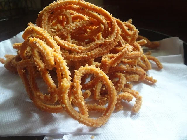 I am very partial to these crunchy chaklis ( Karnataka) , as they have so many flavors, spicy and with hints of masala too. Most of South Indian snack preparation called murukkus , usually do not have spices except cumin , sesame seeds..or cracked pepper in Karasev.So am not abig fan of those almost bland murukus.
