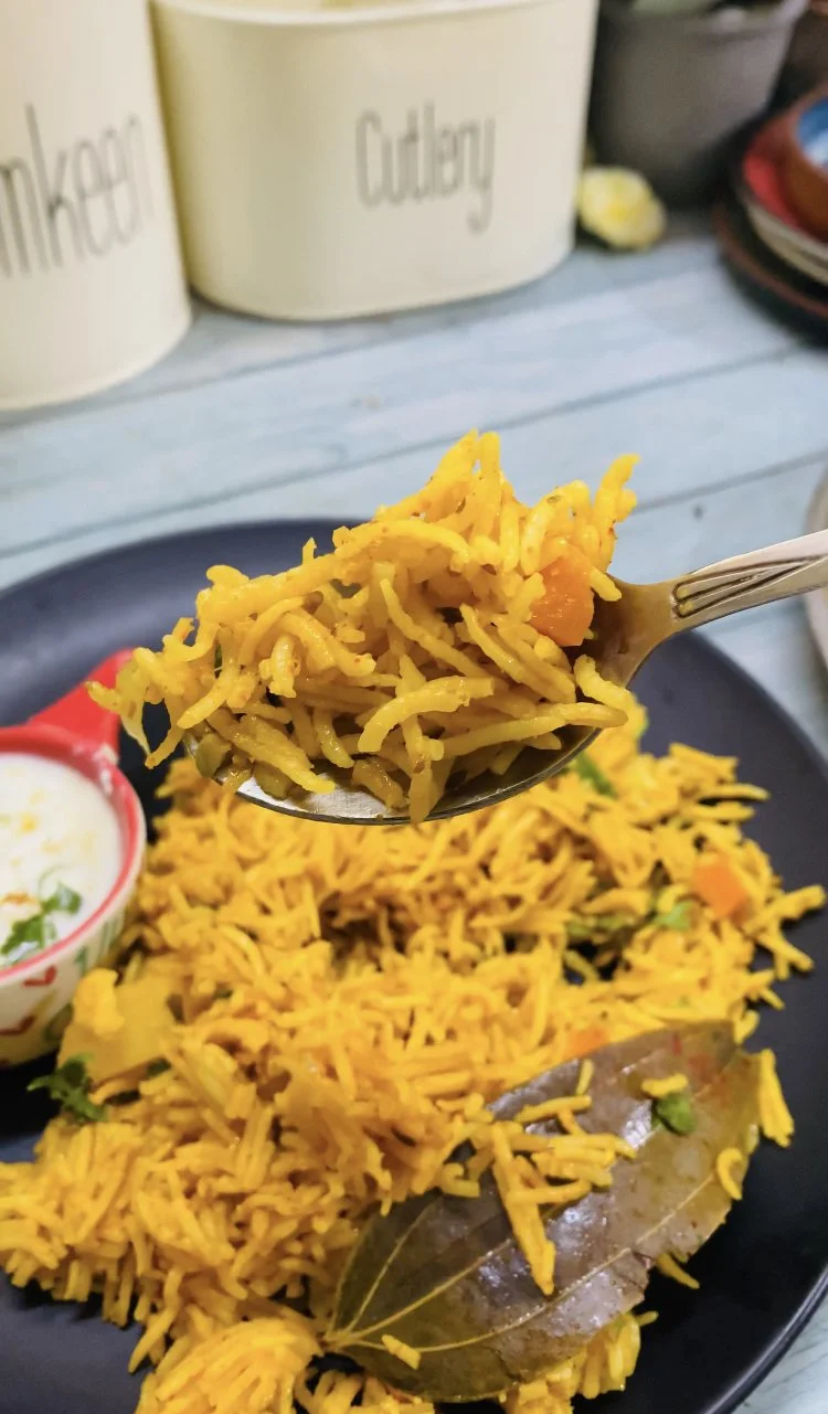 Delicious lip-smacking masala pulav that is not overly spicy yet has the taste and aroma of a delicious biryani .