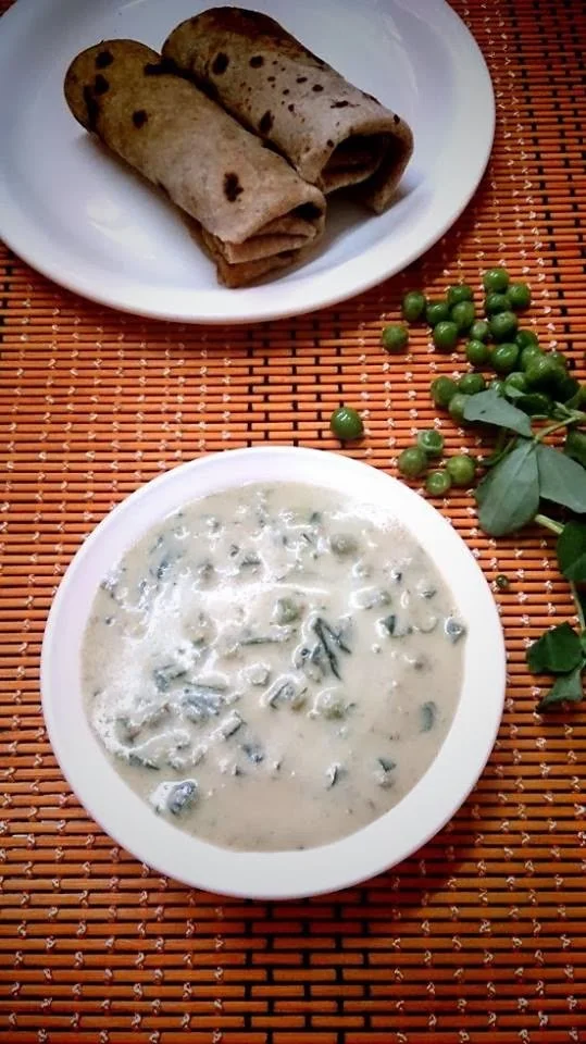 This delightful combination of fresh fenugreek (methi) and green peas creates a truly satisfying dish. Surprisingly, the methi leaves do not impart any bitterness, and the addition of fresh cream enhances the rich, creamy texture. It's a flavorful dish that everyone should try, making it an excellent side for children who usually avoid greens, especially fenugreek.