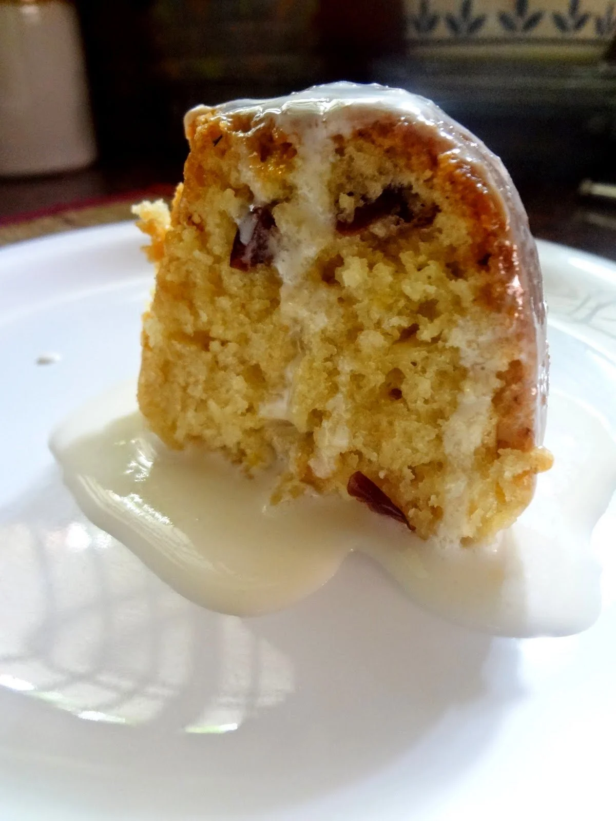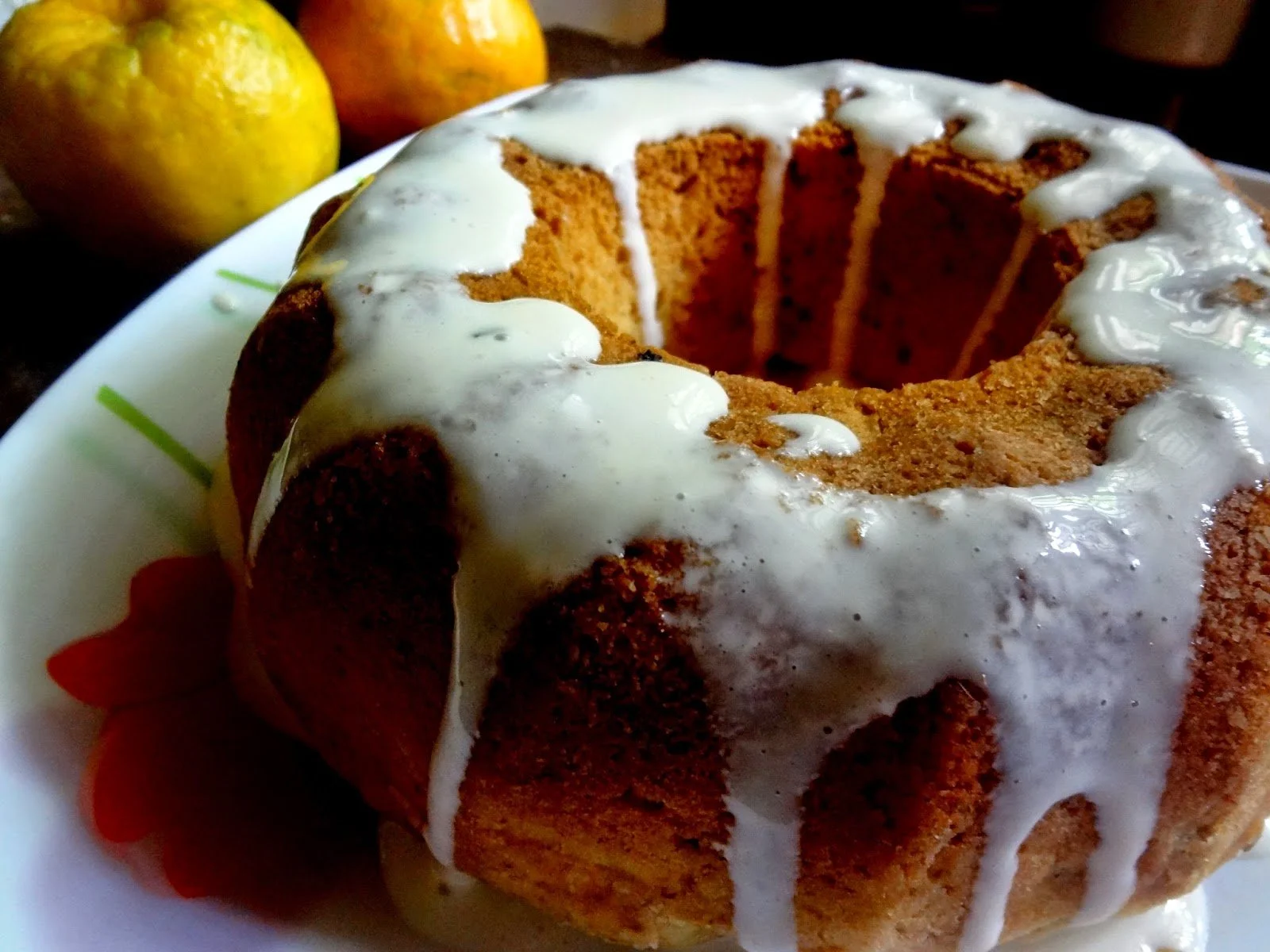 Poke several small holes with a fork or a sharp thin toothpick around the top of the cake. Pour the prepared glaze around it and drizzle liberally.