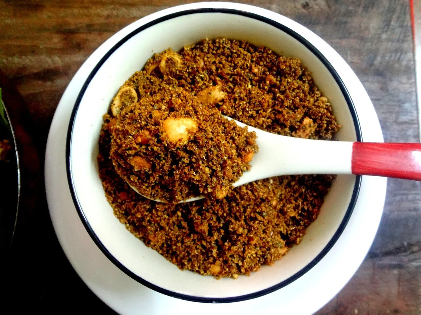 Once cooled, grind everything — including tamarind, sesame seeds, and curry leaves — to a slightly coarse powder. Keep aside.