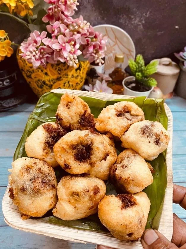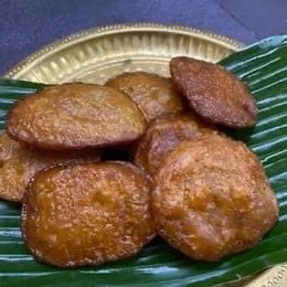 Prepare 'athirasam' by greasing the plantain leaf bits with oil and pressing the balls into thick 'athirasams" Fry in oil, slowly turning both sides.