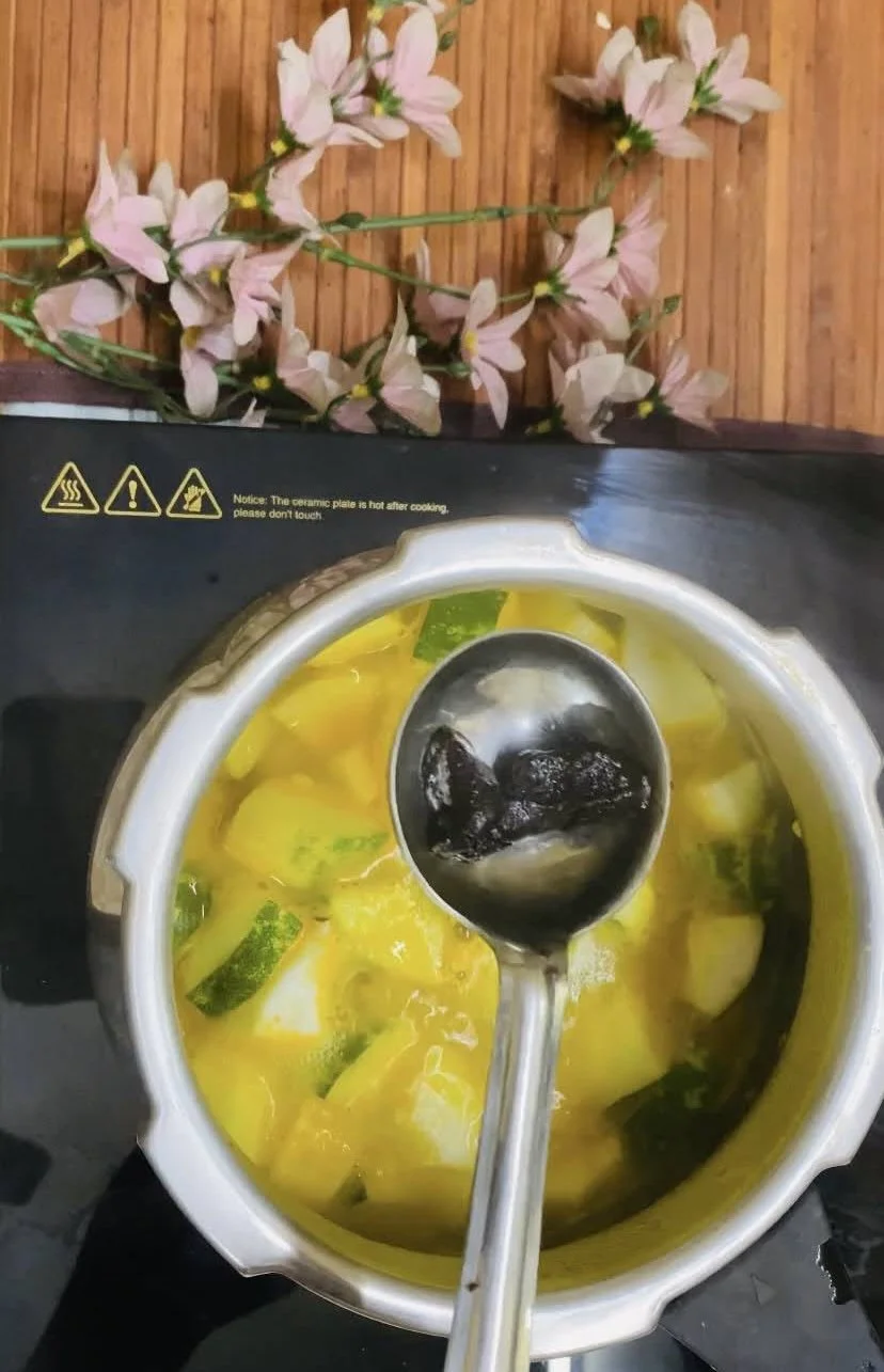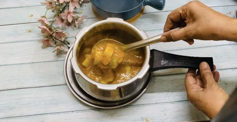 5. Open pressure cooker when cooked , stir the Sambar which Is done perfectly .