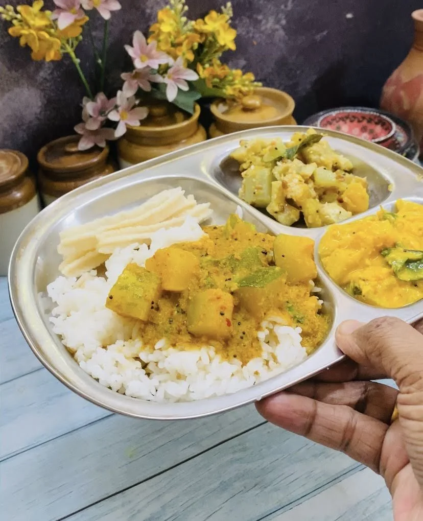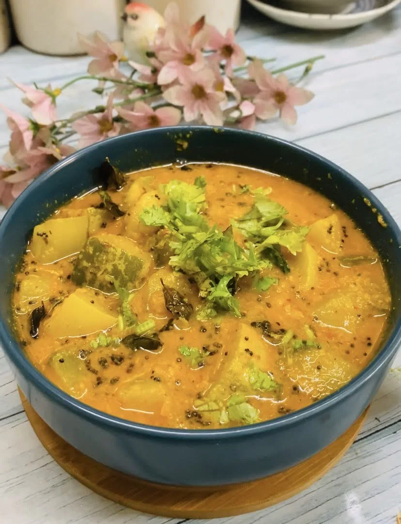 Delicious π temple style sambar with Mangalore cucumber made in a simple but tasty way without onions and garlic . The sambar will tempt you to have several helpings and you will eat more rice than usual . This is the closest it comes to that perfect Temple taste . Many of us have relished the sambar served in temples specially in Karnataka, Udupi Dharmasthala Subramanya . Very little variations are there in each temple according to regional practices .Every bhattar or the temple priest has the recipe handed down to them from their peers or CVhief Priest and kind of a family secret although you find many proiest willing to share the method in temple premises .