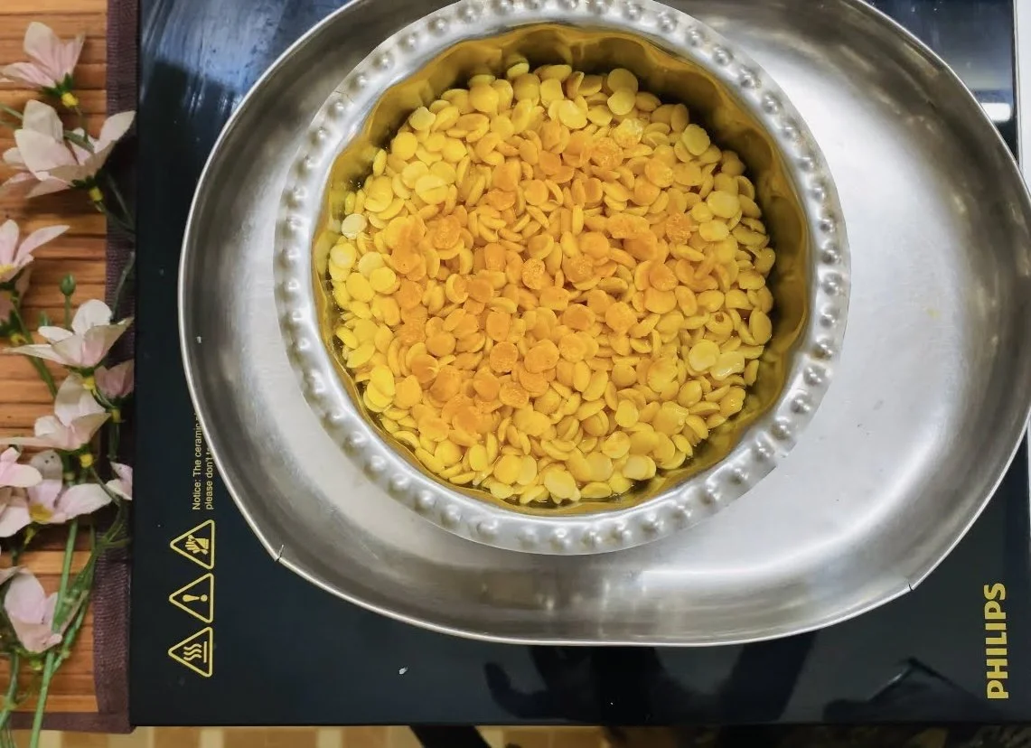 2. Pressure cook toor dal with a pinch of turmeric powder , keep aside .
