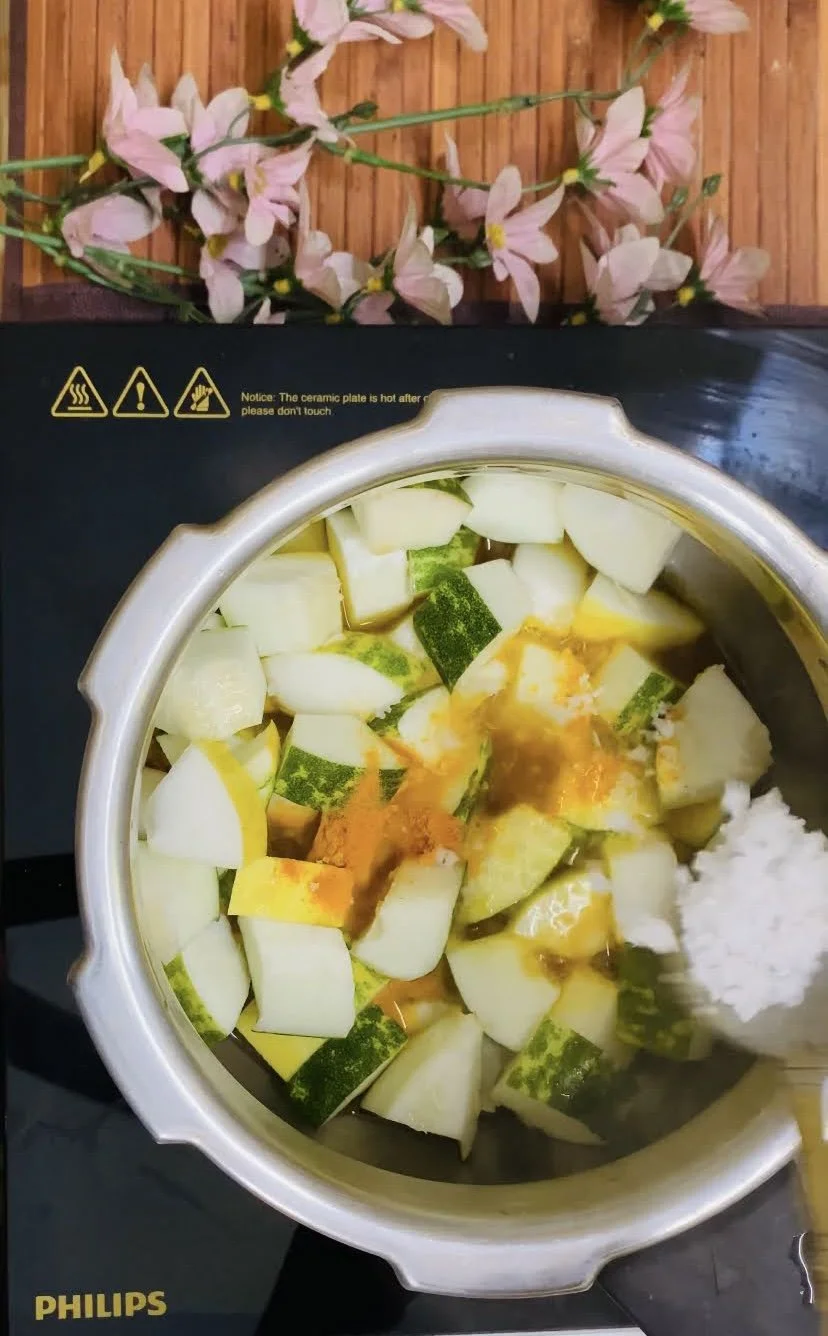 4. Take the cooker , add the chopped pieces of cucumber with 1/2 cup water . Add turmeric powder , salt , few curry leaves , let It come to one boil , then add Tamrind paste, mix well , add cooked dal , ground paste , close cooker and allow 2 whistles .