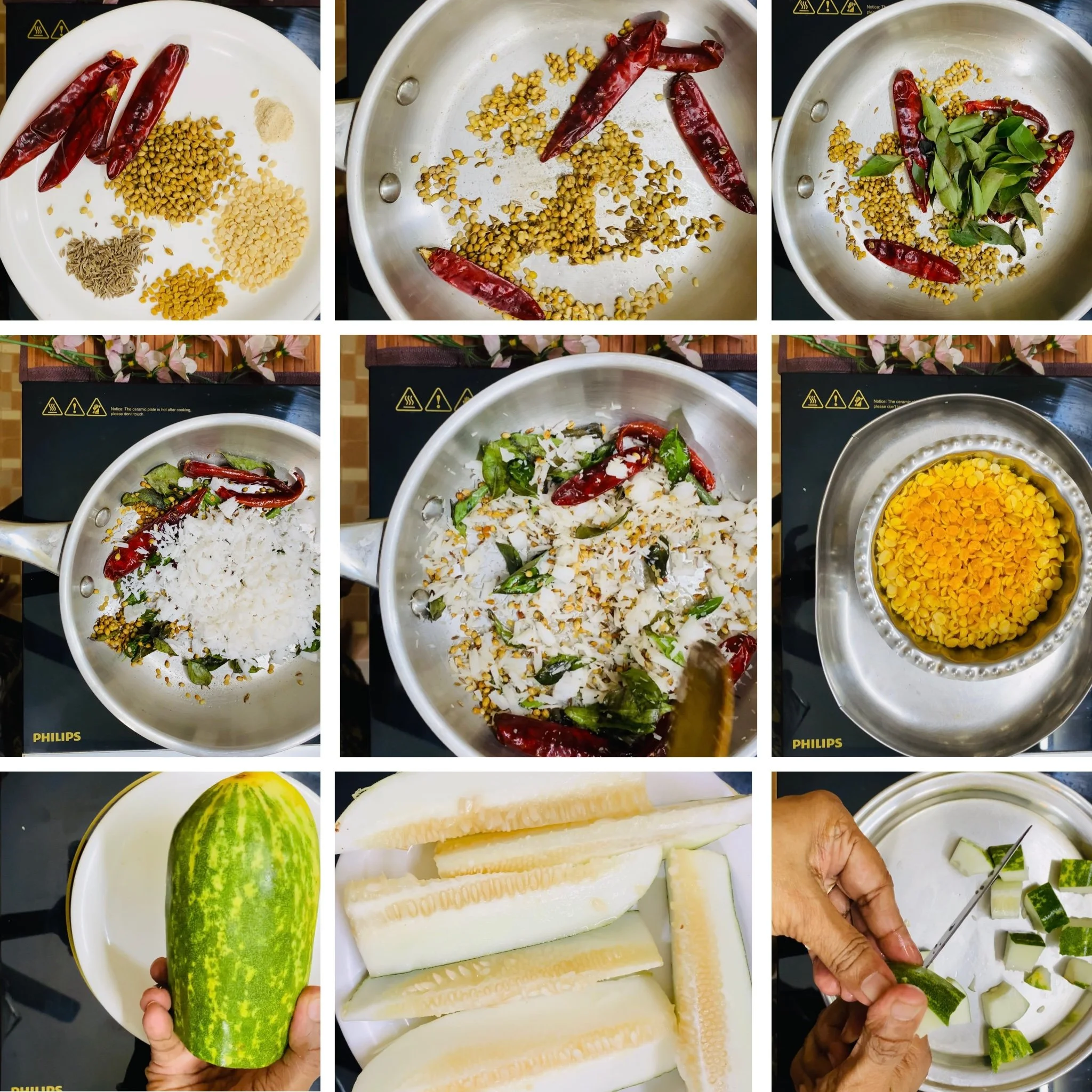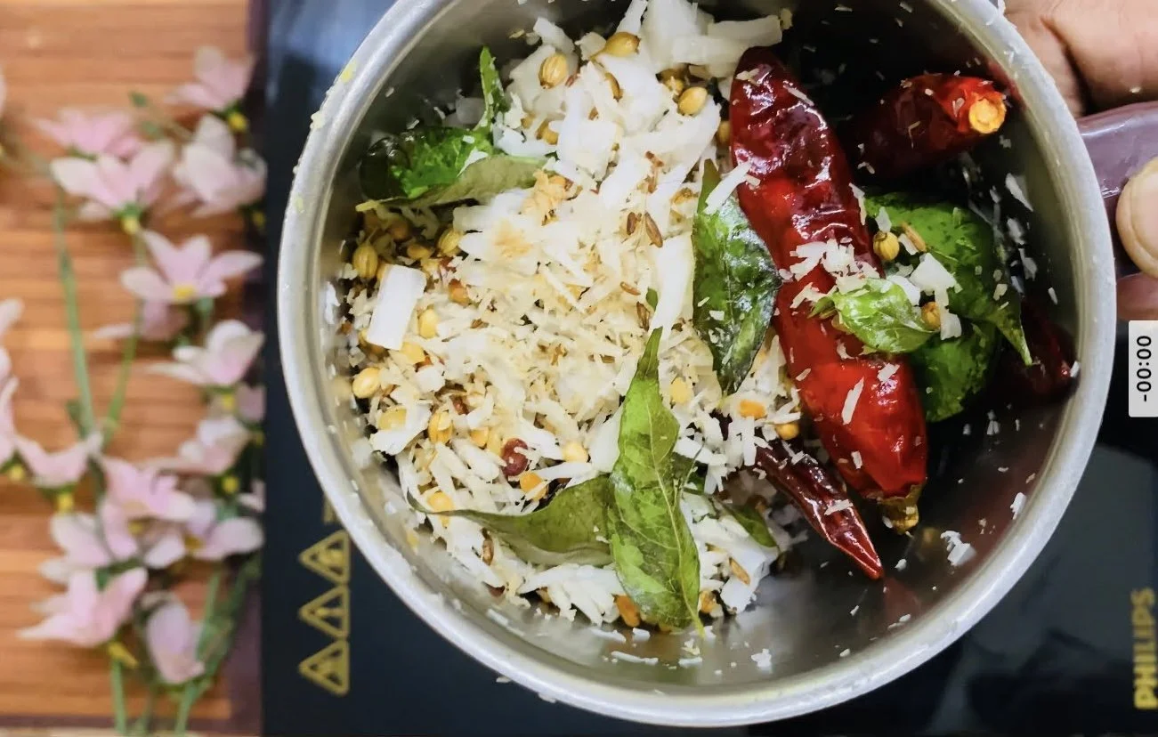 1. To a pan , add 1 tsp coconut π₯₯ oil . Roast Ingredients Mentioned . Add few curry leaves , 1/2 cup grated coconut π₯₯ , roast till aromatic. Allow to cool , grind to a smooth paste .