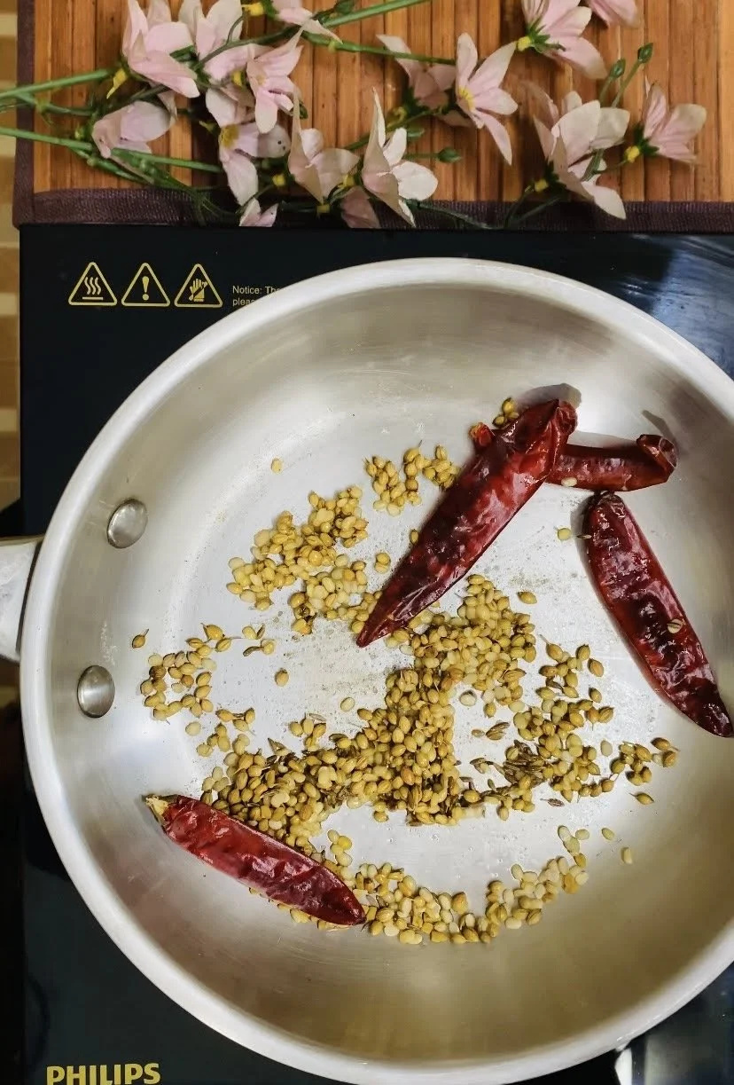 To a pan , add 1 tsp coconut π₯₯ oil . Roast Ingredients Mentioned . Add few curry leaves , 1/2 cup grated coconut π₯₯ , roast till aromatic. Allow to cool , grind to a smooth paste