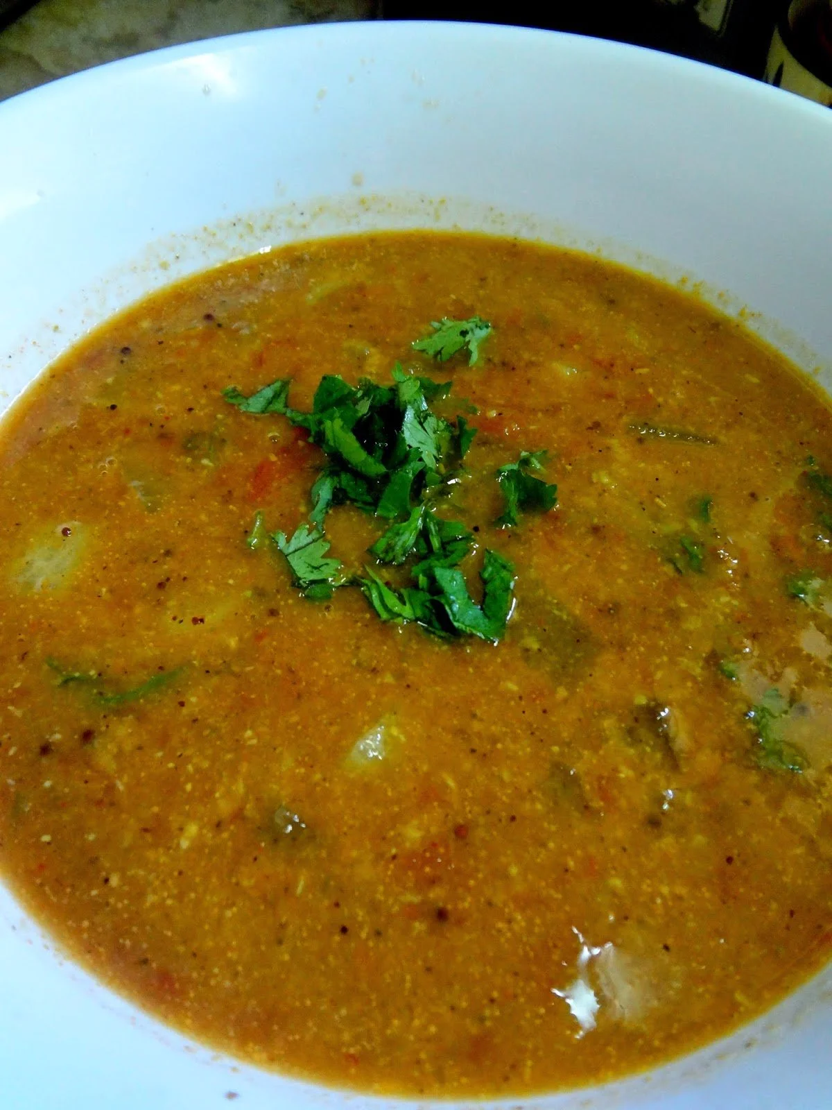 Tasty delicious Udupi sambar is ready to be served with idlis, sambar, or plain rice.
