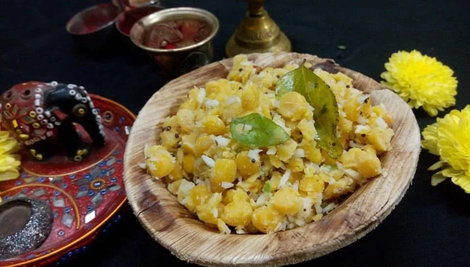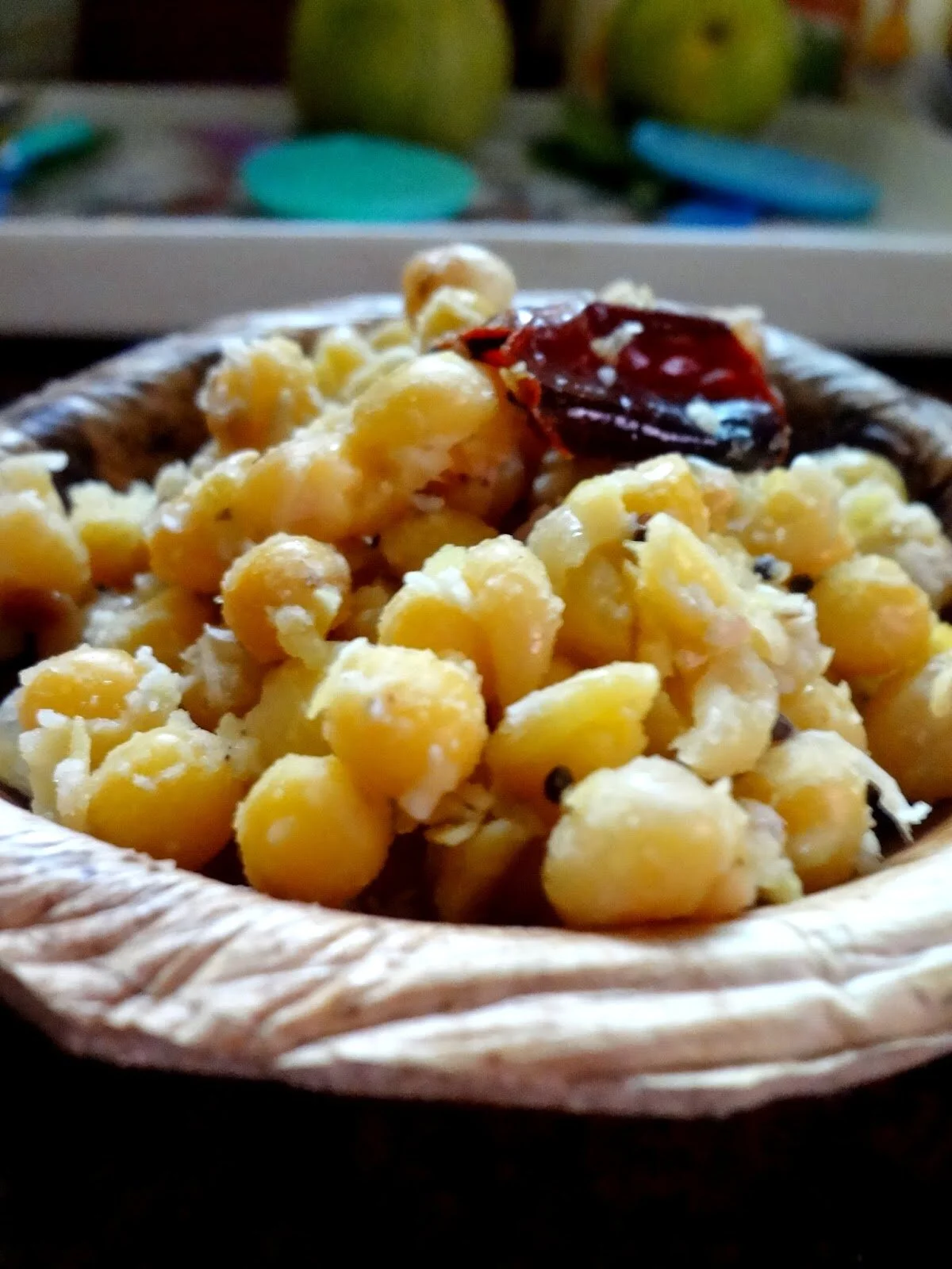Sundal is a typical preparation by cooking dried peas or other legumes, overnight, pressure cooking them to a light softness. The cooked peas or lentils are then seasoned with a tempering of mustard seeds, chillis, curry leaves and sprinkled with grated fresh coconut.